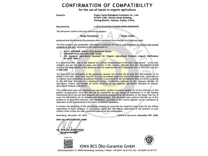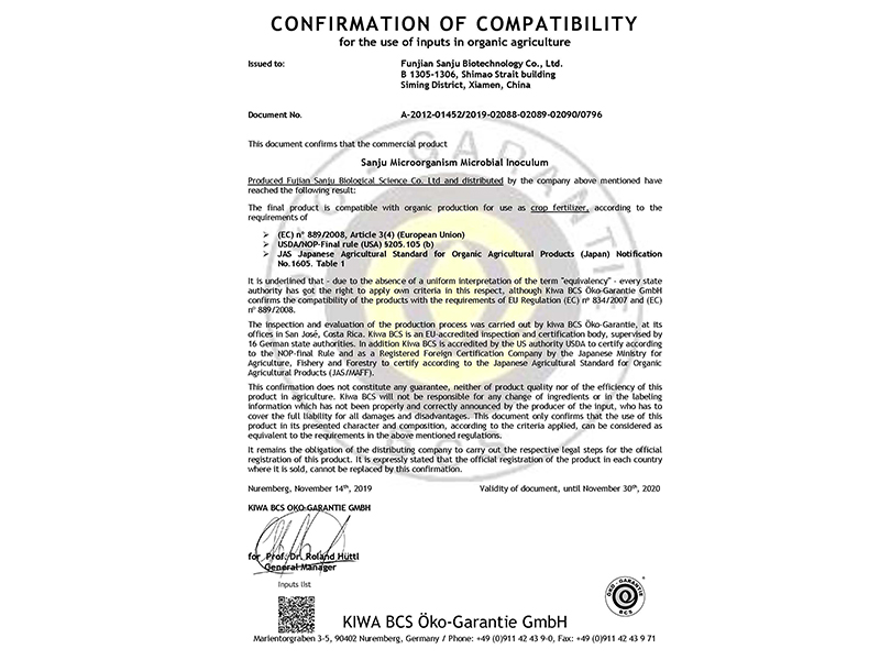 微生物菌劑歐盟有機(jī)認(rèn)證證書(shū)