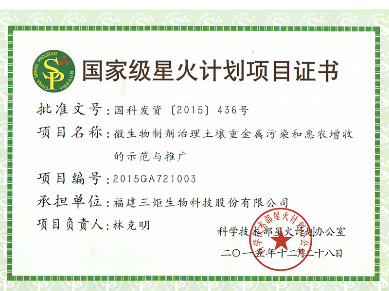 國(guó)家級(jí)星火計(jì)劃項(xiàng)目證書(shū)