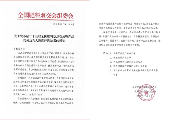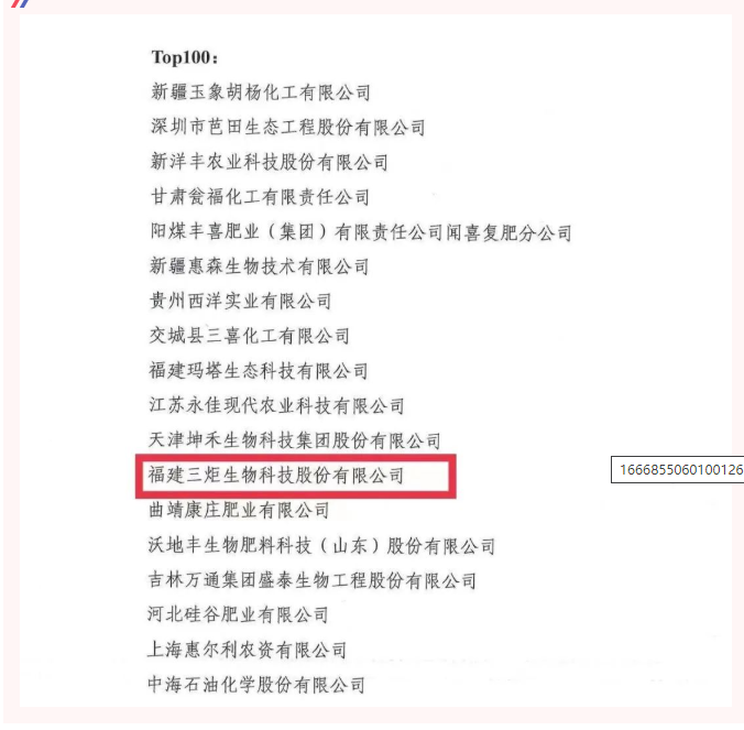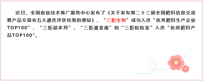 【喜訊】“三炬生物”成功入選“優(yōu)秀肥料企業(yè)TOP100”,多項產(chǎn)品入選“優(yōu)質(zhì)肥料產(chǎn)品TOP100”!